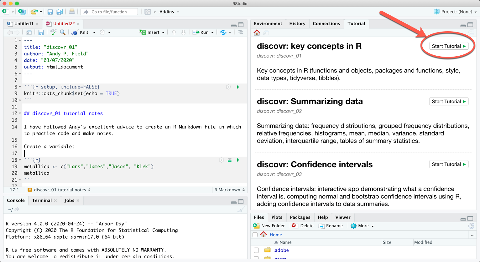 learnr::run_tutorial("name_of_tutorial", package = "discovr")and replace “name of tutorial” with the name of the tutorial you want to run. For example, to run tutorial 2 execute: