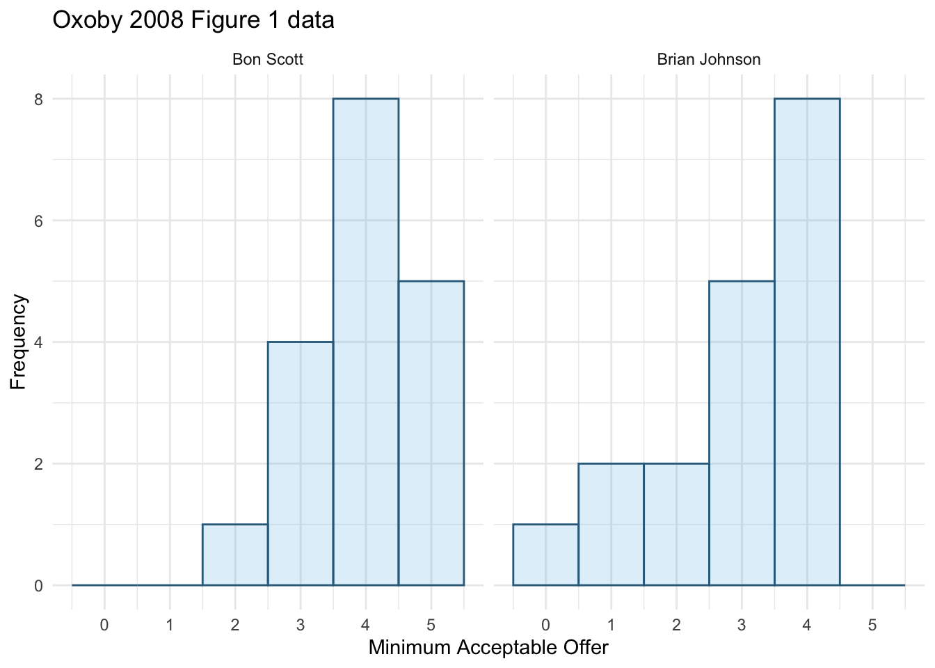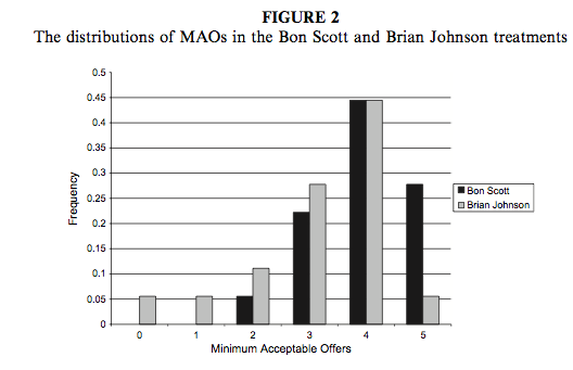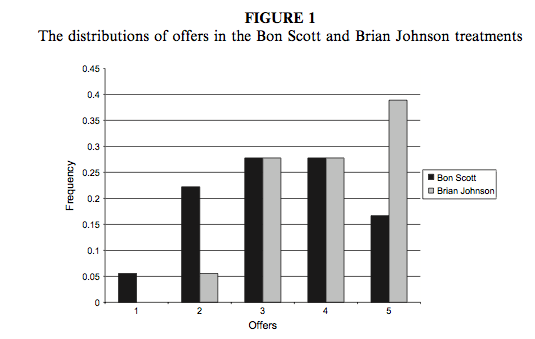 In Labcoat Leni’s Real Research 4.1 we came across a study that compared economic behaviour while different music by AC/DC played in the background. Specifically, Oxoby manipulated whether the background song was sung by AC/DC’s original singer (Bonn Scott) or his replacement (Brian Johnson). He measured how many offers participants accepted and the minimum offer they would accept (