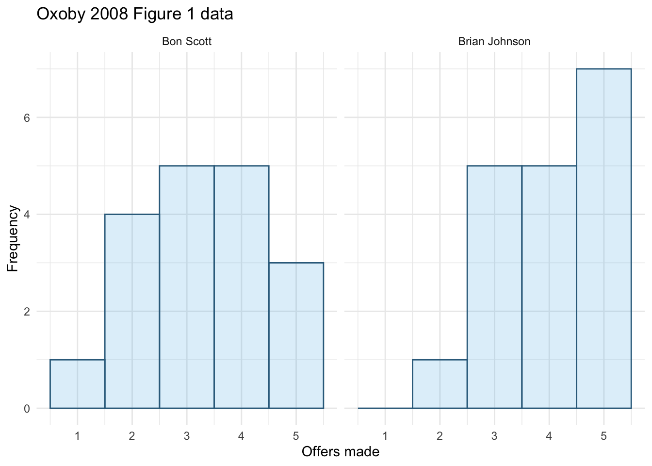 Using a task from experimental economics called the ultimatum game, individuals are assigned the role of either proposer or responder and paired randomly. Proposers were allocated $10 from which they had to make a financial offer to the responder (i.e., $2). The responder can accept or reject this offer. If the offer is rejected neither party gets any money, but if the offer is accepted the responder keeps the offered amount (e.g., $2), and the proposer keeps the original amount minus what they offered (e.g., $8). For half of the participants the song ‘It’s a long way to the top’ sung by Bon Scott was playing in the background; for the remainder ‘Shoot to thrill’ sung by Brian Johnson was playing. Oxoby measured the offers made by proposers, and the minimum accepted by responders (called the minimum acceptable offer). He reasoned that people would accept lower offers and propose higher offers when listening to something they like (because of the ‘feel-good factor’ the music creates). Therefore, by comparing the value of offers made and the minimum acceptable offers in the two groups he could see whether people have more of a feel-good factor when listening to Bon or Brian. These data are estimated from Figures 1 and 2 in the paper because I couldn’t get hold of the author to get the original data files. The offers made (in dollars) are as follows (there were 18 people per group):