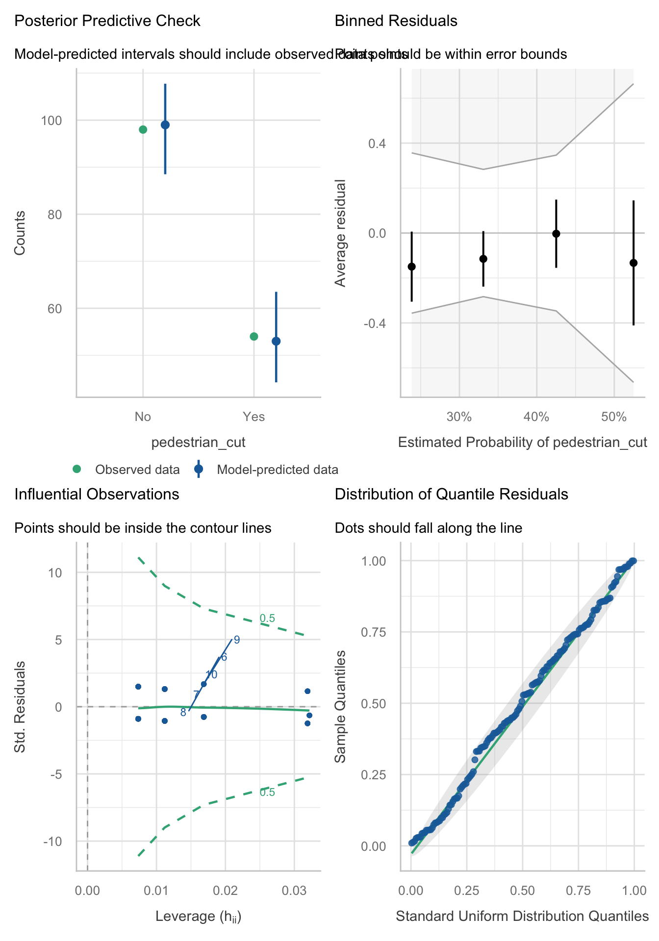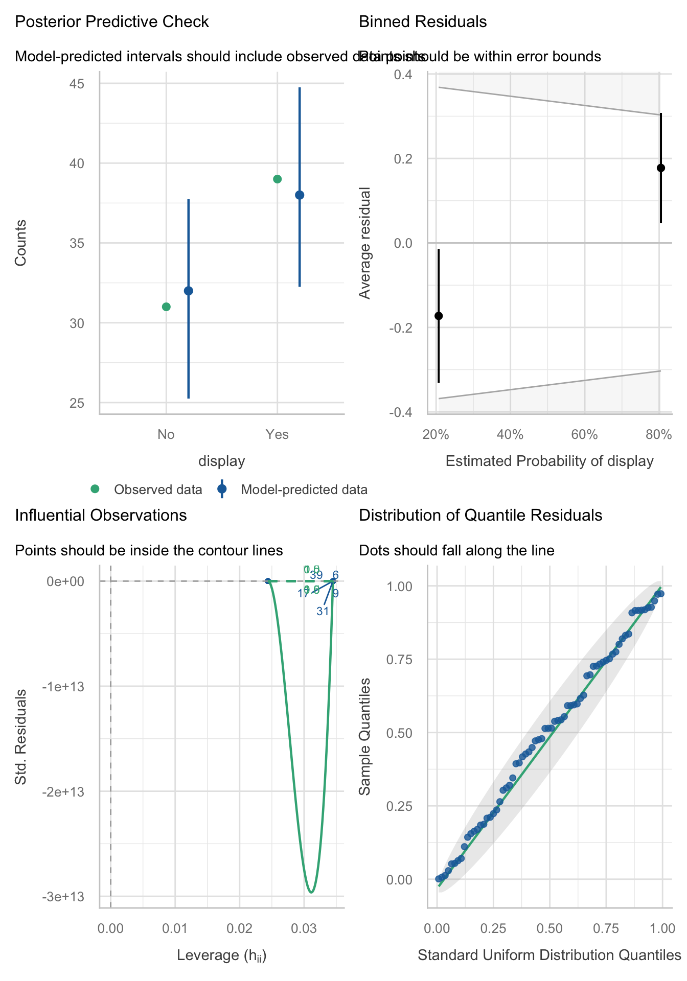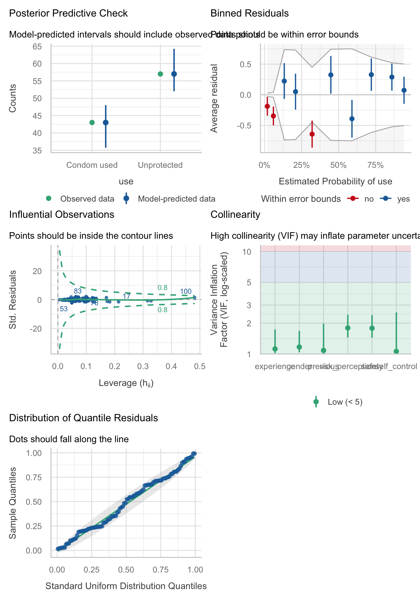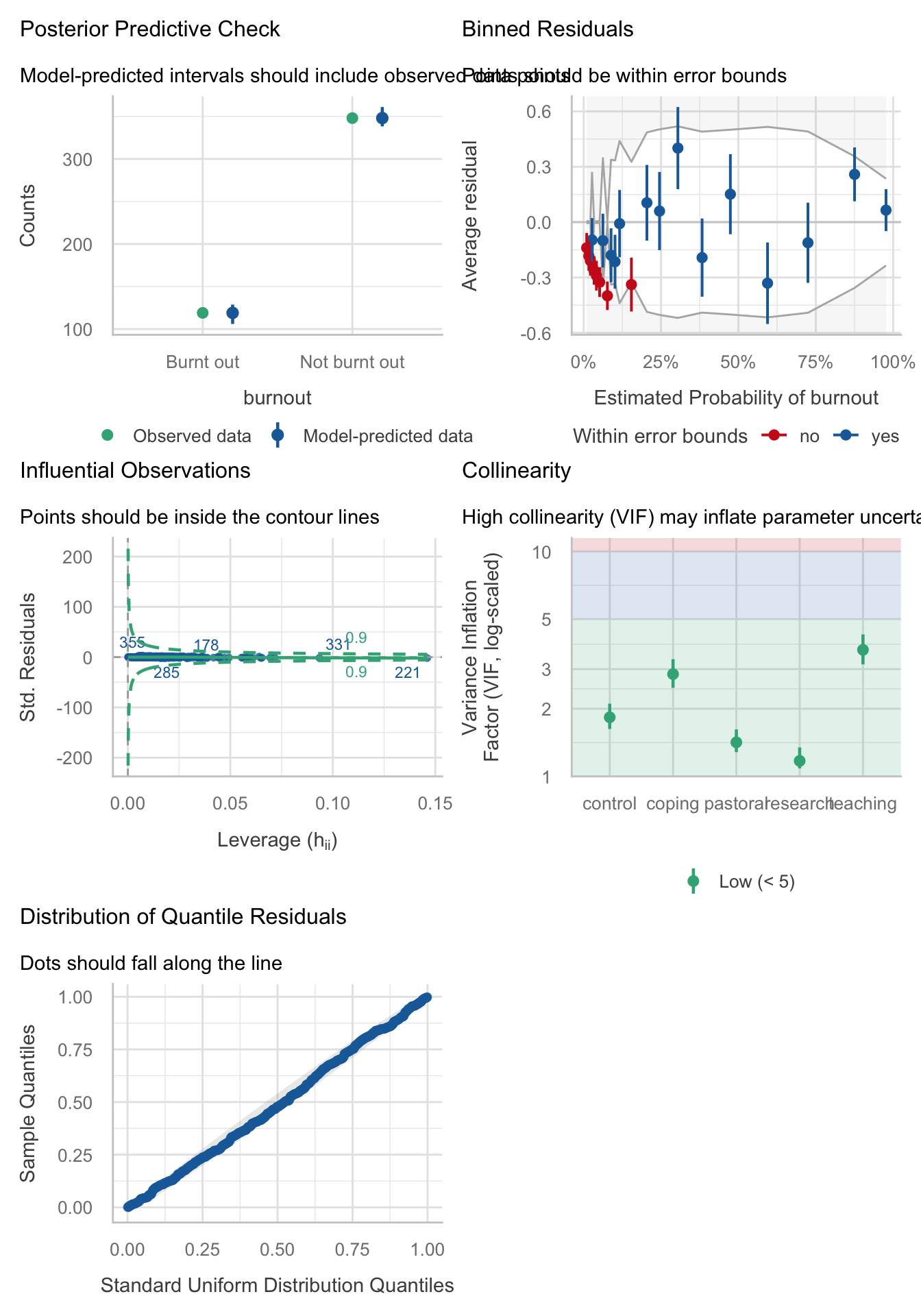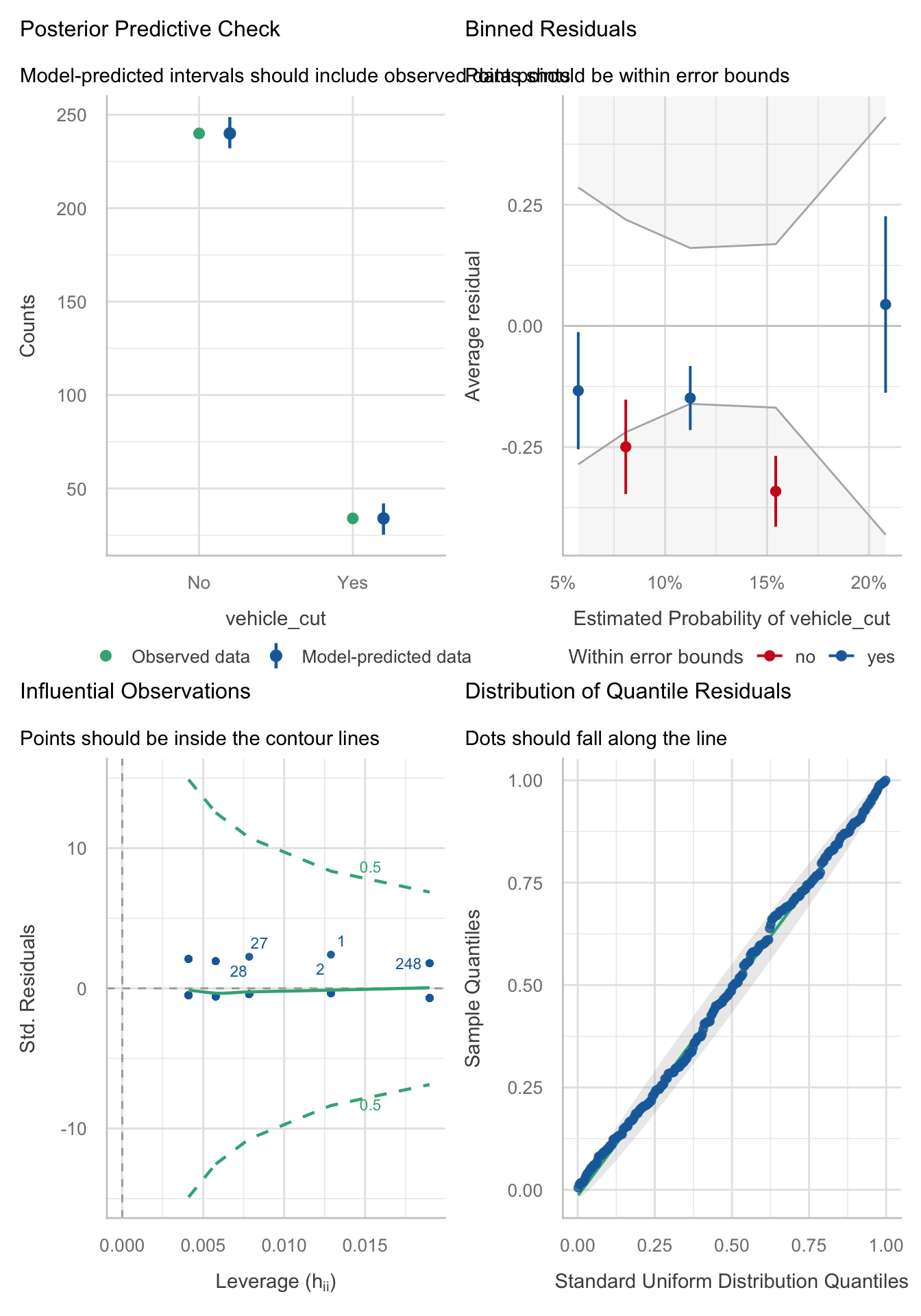 Figure 97 shows the assumptions are largely met. Top left shows that the observed values fall with the corresponding prediction interval so the model is capturing what we observed. The top right shows that the average deviance residuals and their intervals do not fall within the error bounds. The middle-left plot indicates no influential cases and the middle right suggests no reason to suspect multicollinearity. The bottom left plot shows the residuals fall along the diagonal line, so are distributed as we’d like.