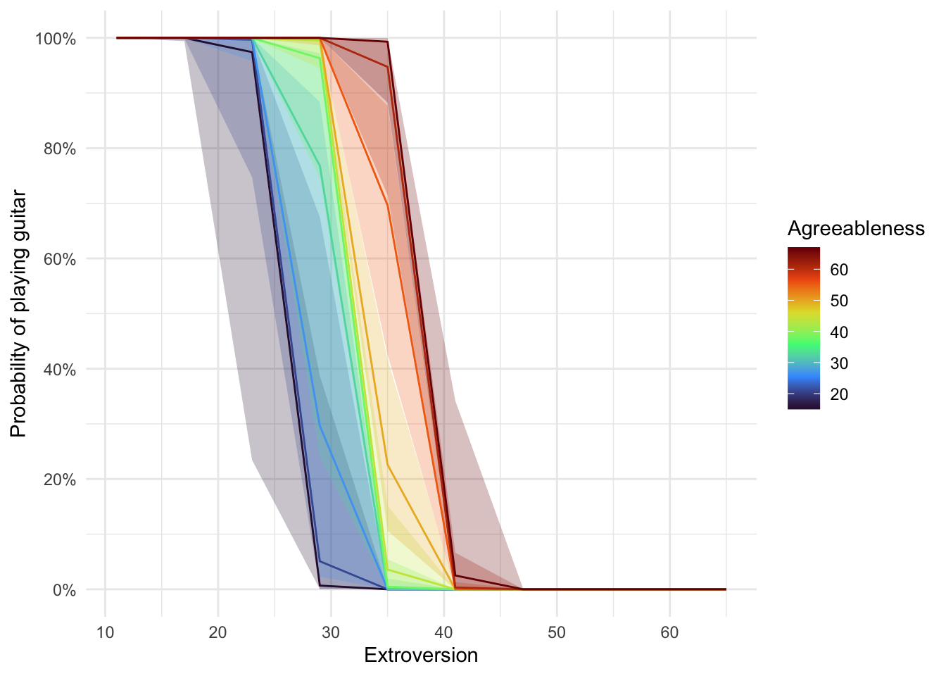 labs(x = "Extroversion", y = "Probability of playing guitar", colour = "Agreeableness", fill = "Agreeableness") +